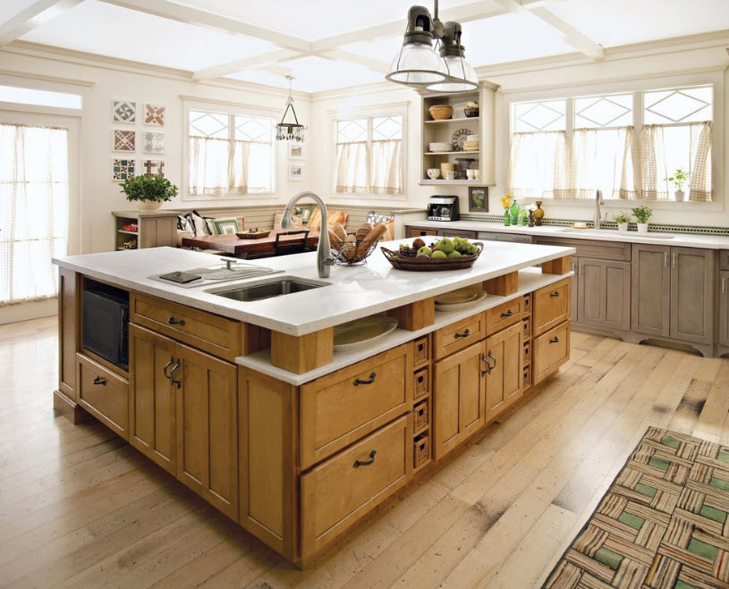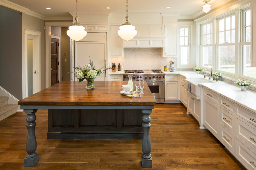 Прежде чем начинать ремонт, необходимо все тщательно продумать и подготовить грамотный дизайн-проект. Большое кухонное пространство в загородном доме нередко включает в себя несколько зон – саму кухню с гарнитуром и плитой для готовки, а также гостиную и столовую. Плюс нередко здесь расположена и дровяная печь отопления или камин.