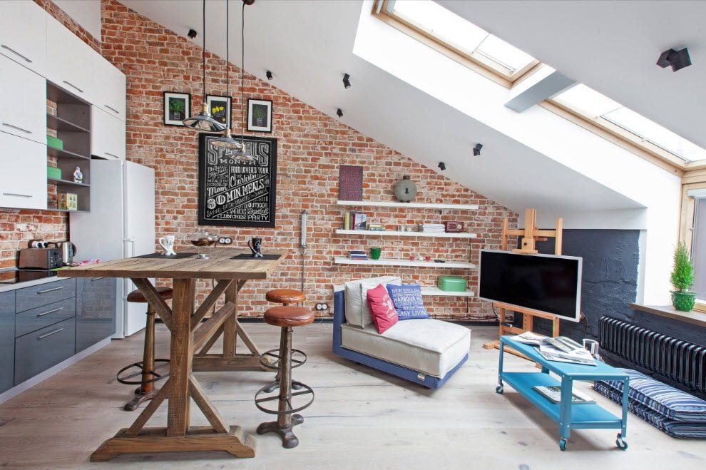 Невысокие потолки покрасили в белый, чтобы визуально приподнять их. Балки также прекрасно выполнили свою функцию, зрительно отодвинув потолок. Кроме того, они стали основой для точечного освещения.