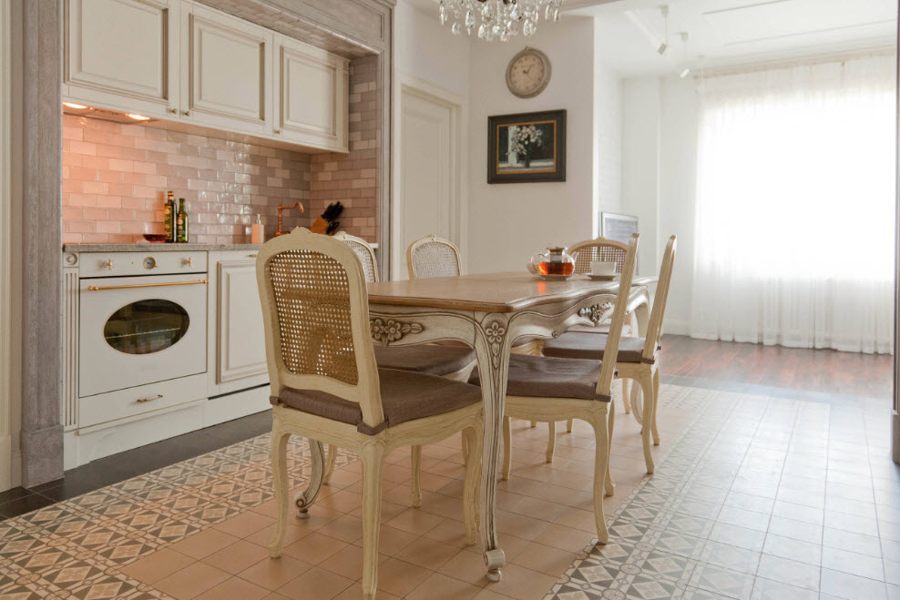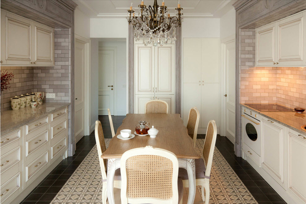 Совмещайте правильно классические и современные элементы. К массивной вычурной люстре подберите светодиодные встроенные светильники над рабочим фартуком.
