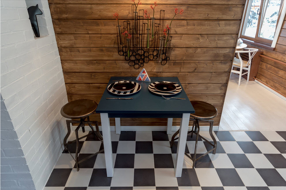 Керамика в интерьере явно намекает на ретро. Стоит только взглянуть на фарфоровый пакет молока на столе, и настроение комнаты сразу становится понятным. Стол повторяет оттенок кухонного гарнитура, черно-белые тарелки перекликаются с полом. Завершает сложившийся интерьерный образ цветочная ваза уникальной конструкции.
