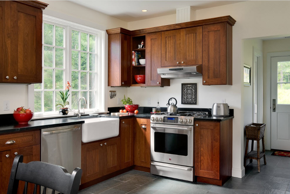 Угловая кухня с окном в рабочей зоне — это оптимальный вариант для размещения мебели в небольшом помещении. При помощи такого нехитрого приема можно значительно увеличить площадь помещения визуально. Мойка, размещенная у батареи, способна замаскировать систему отопления.