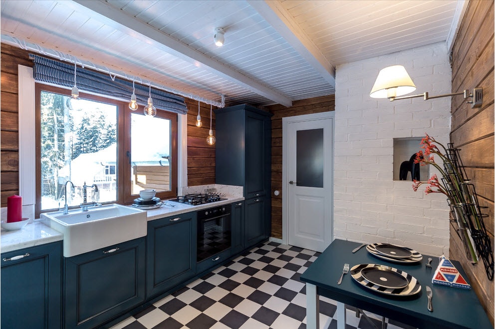 Кухонные фасады в насыщенной синей палитре с патиной, которая отлично комбинирует с белым потолком и древесными ореховыми стенами. Столешница изготовлена из светлого мрамора с темными разводами. На полу черно-белая плитка в шахматной раскладке заметно освежает интерьер, делает его более интересным и динамичным.