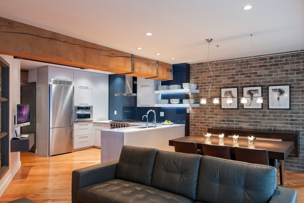 Применяется открытая планировка, которая поддерживает широту пространства. В этом случае все комнаты, кроме санитарных, объединяются вместе, что позволяет увеличить площадь. Отсутствие перегородок делает помещение просторным. Все пространство оформляется в одном стиле. Исключение составляет кухонная зона. При ее разработке предпочтение отдается керамической плитке