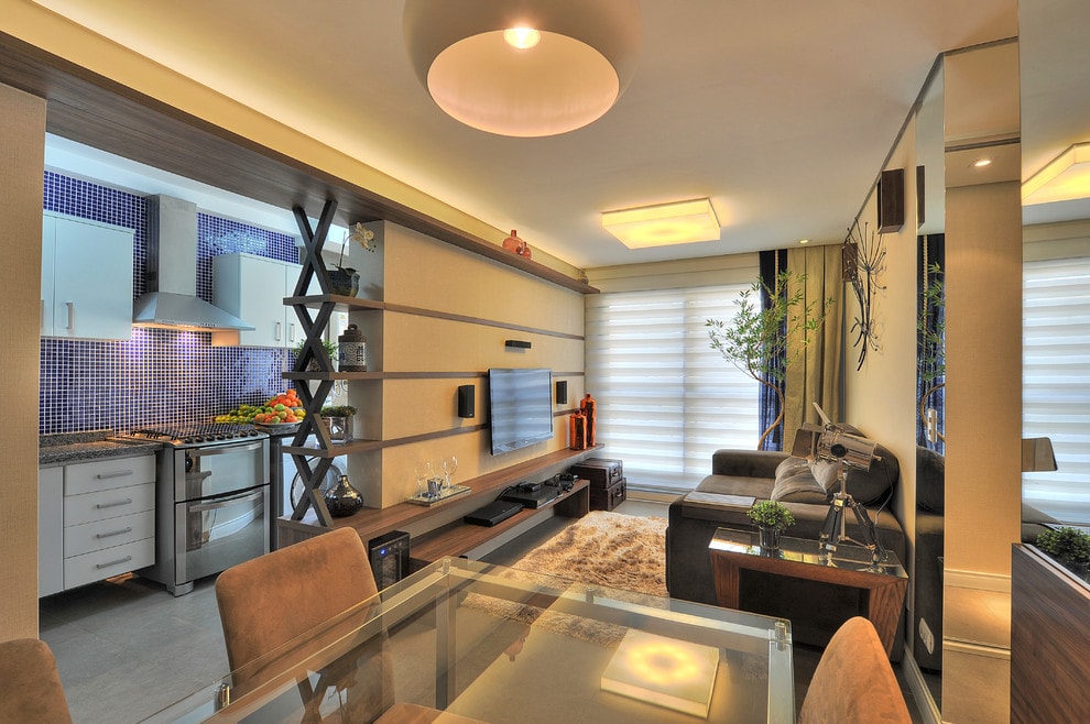 Визуально изменить пропорции и раздвинуть стены помещения поможет освещение. Точечные светильники по периметру вносят свет в угловую часть пространства и зрительно раздвигают стены. Хорошее решение для небольшой гостиной — зеркала и мебель с глянцевыми отражающими поверхностями. Единственное условие — такими поверхностями не стоит загромождать помещение.