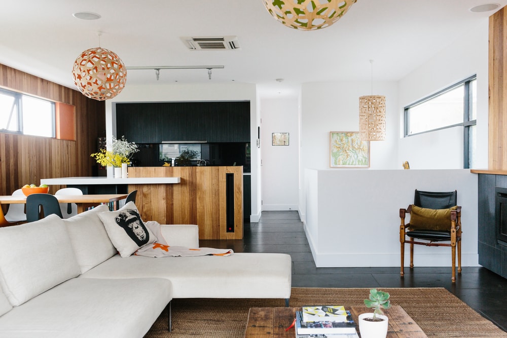 Мебель – с плавными и округлыми формами. От модерна можешь позаимствовать тягу к асимметрии. Экспериментируй с необычными фактурами: керамикой, плетеными вставками, мешковиной. Отлично впишется в интерьер и хендмейд.