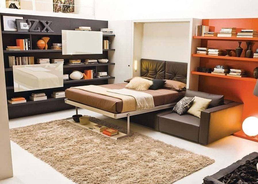 При невозможности выделить для сна отдельную комнату или личном желании создать совмещённый вариант гостиной и спальни также используйте разборную мебель. Это позволит быстро и легко трансформировать кровать в диван и встречать гостей.