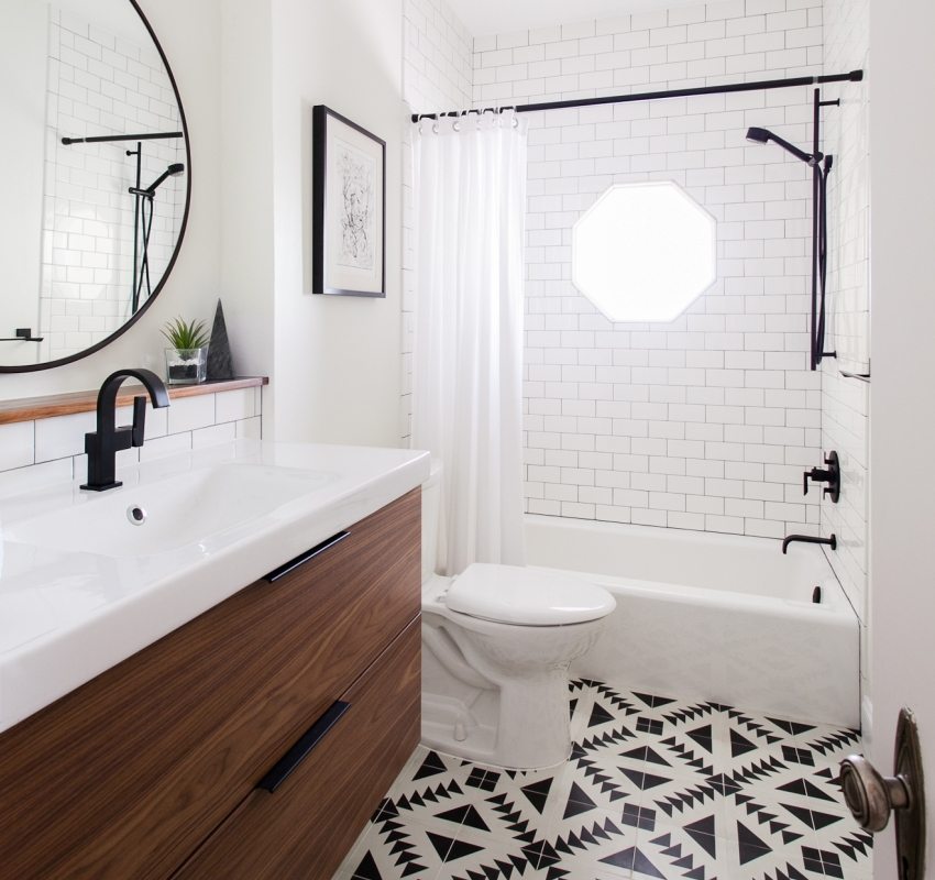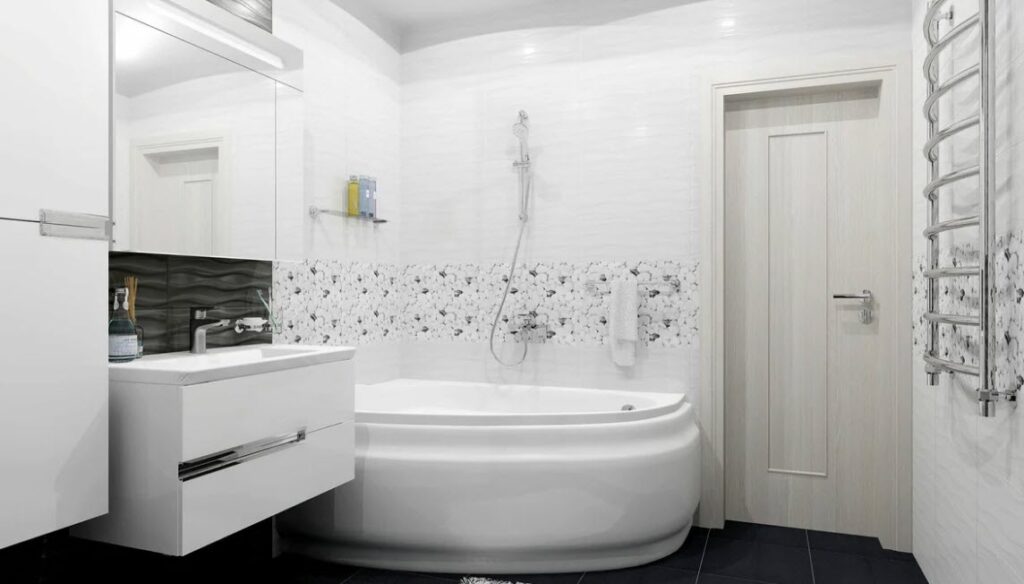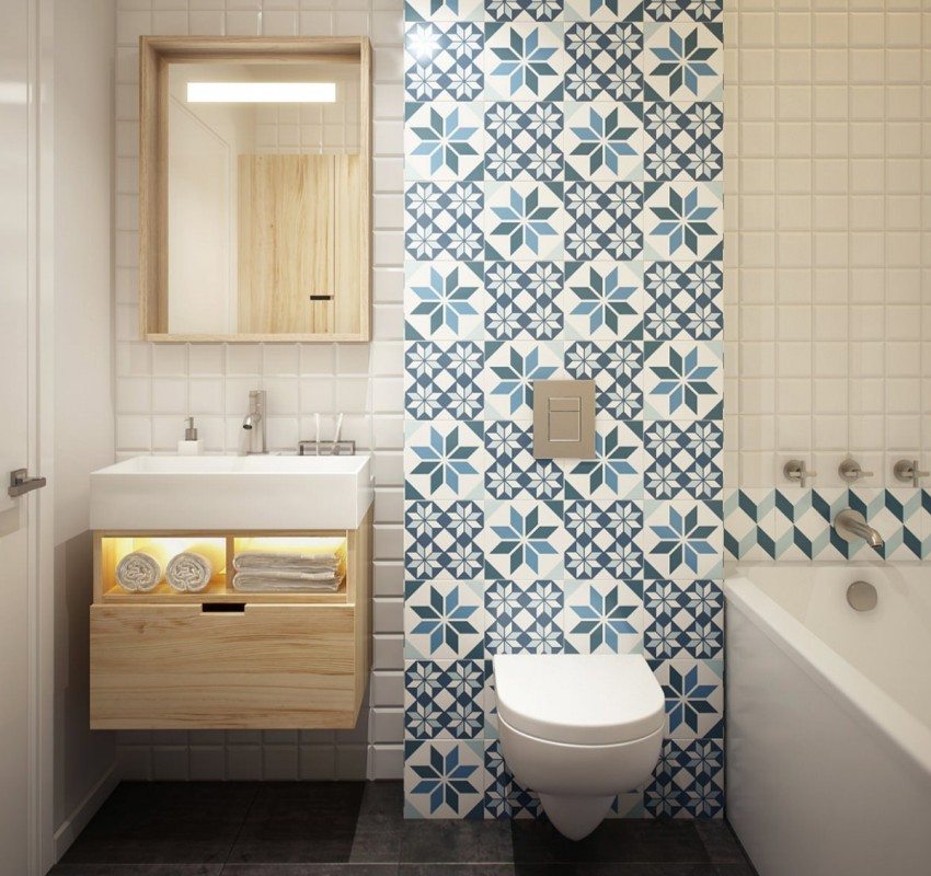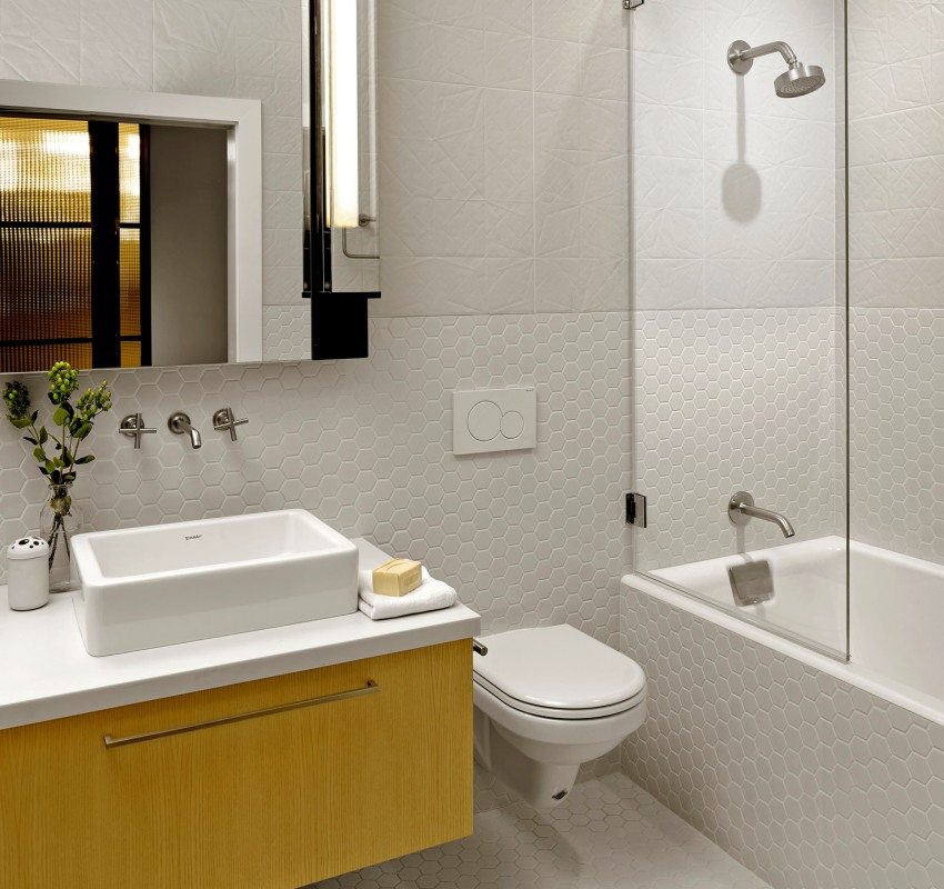 Для отделки ванной можно сочетать плитку разных форм и фактур
