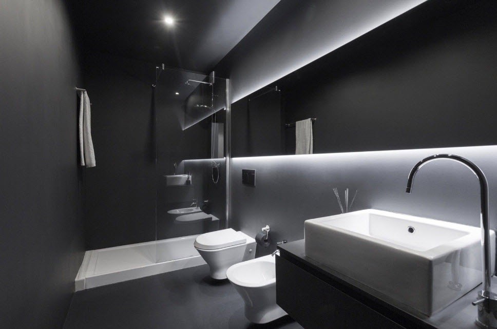 При работе с ними важно, чтобы в помещении было хорошее и многоуровневое освещение, в противном случае санузел будет выглядеть мрачно.