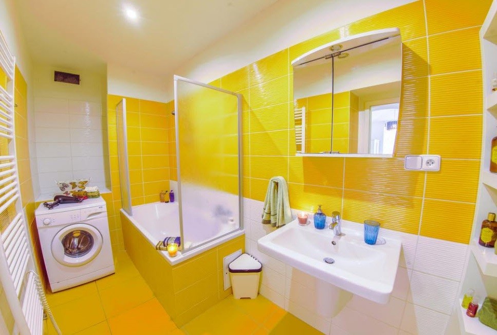 Желтая или оранжевая ванная комната 6 кв.м. – помещение, наполненное жизнерадостностью и беспечностью. Излишне яркий интерьер может негативно влиять на самочувствие, поэтому используйте эти цвета дозировано или выберите их пастельные оттенки.