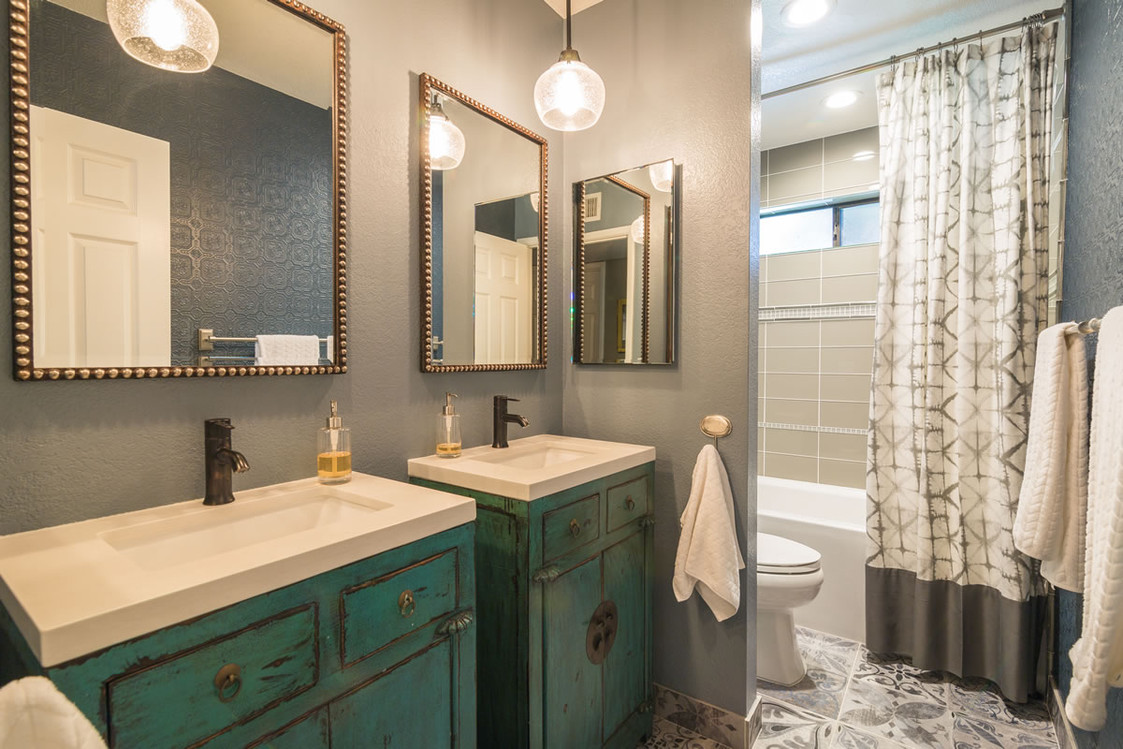Зеркало необходимо в интерьере любой ванной комнаты, а особенно маленькой. Этот предмет декора используют как в единичном, так и во множественном числе (например, набор из нескольких элементов, постепенно уменьшающихся по размеру). Хорошей идеей будут зеркальные дверцы у навесного шкафчика или раздвижной дверной системы. Такая мебель зрительно расширит пространство небольшого санузла и добавит света.