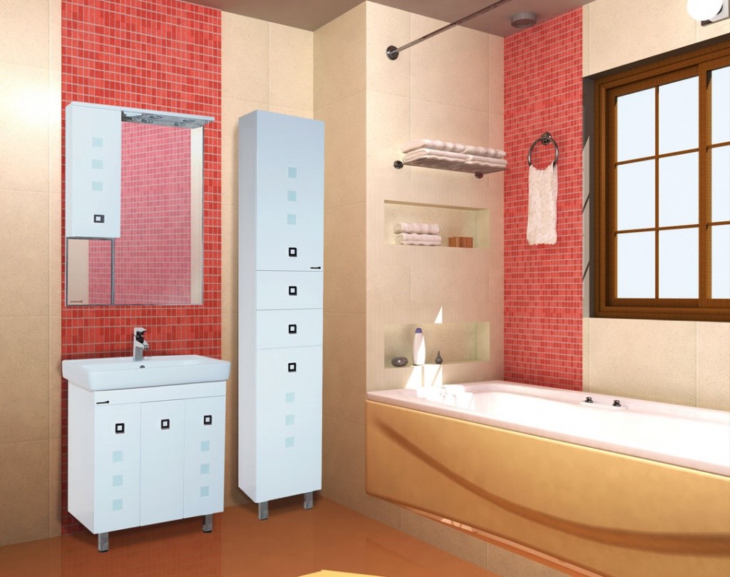 Больших размеров может быть только зеркало, отражающая поверхность увеличит пространство. Шампуни и гели для душа удачно разместятся на угловой полке рядом с ванной или душем.