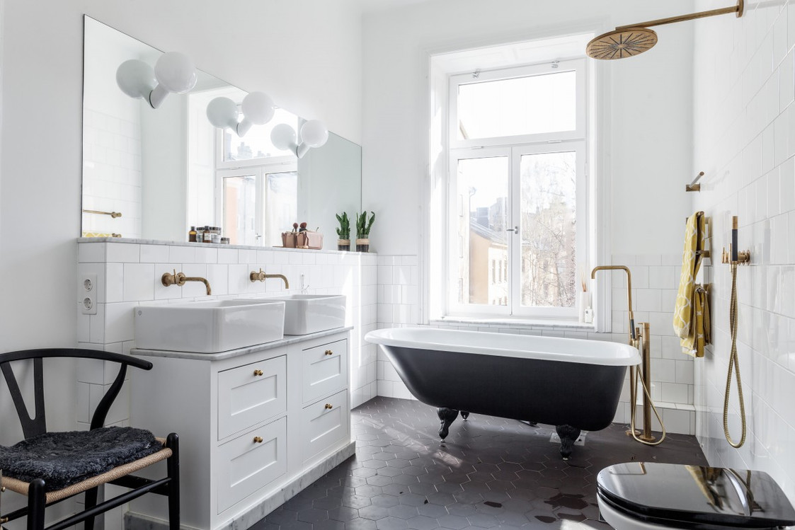 Белые стены ванной комнаты в сочетании с темной плиткой и мебелью