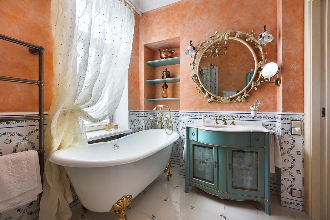 Очарование прованса создаст особую атмосферу для релакса в ванной комнате. Основные элементы этого стиля – цветочные орнаменты и узоры, воздушные занавески и светлая цветовая гамма, деревянные шкафчики и пейзажи в отделки.