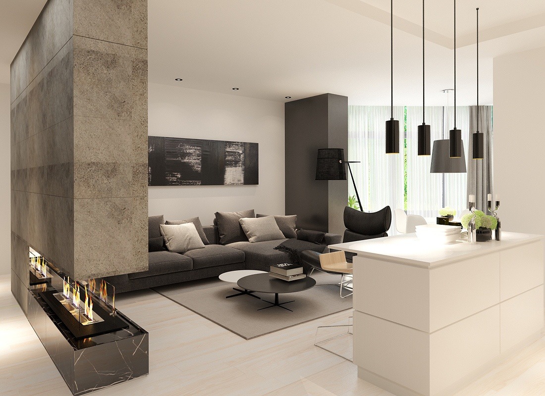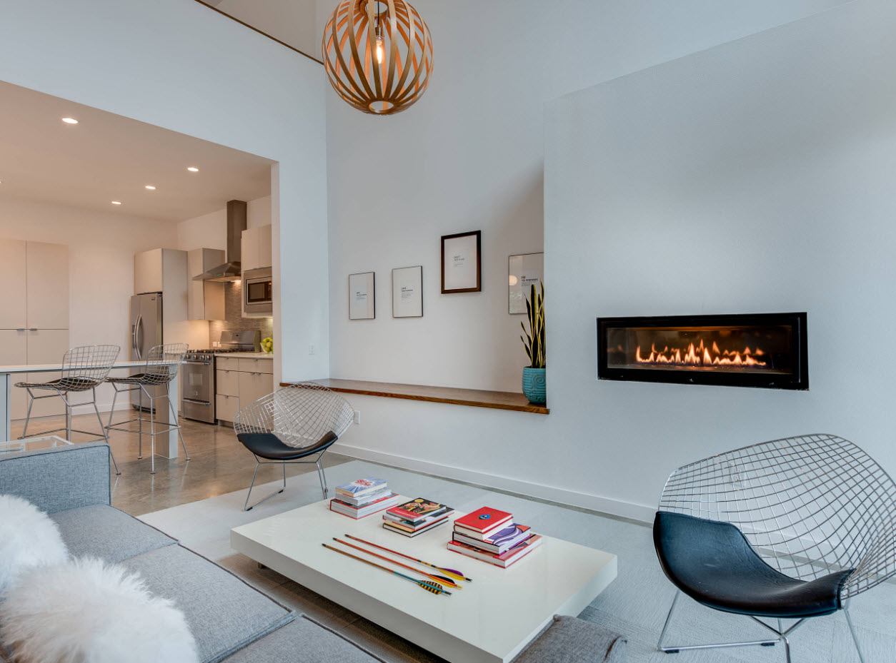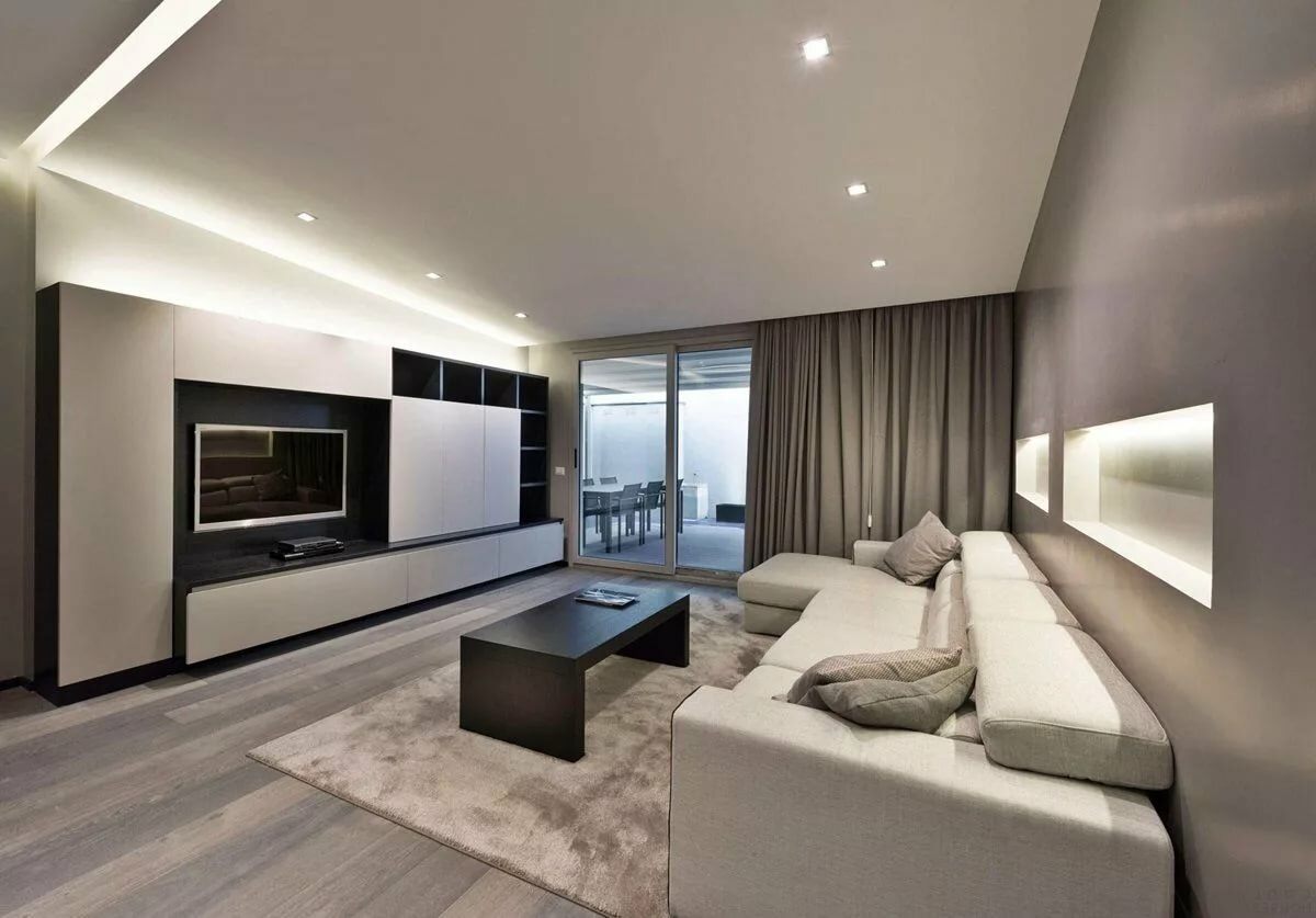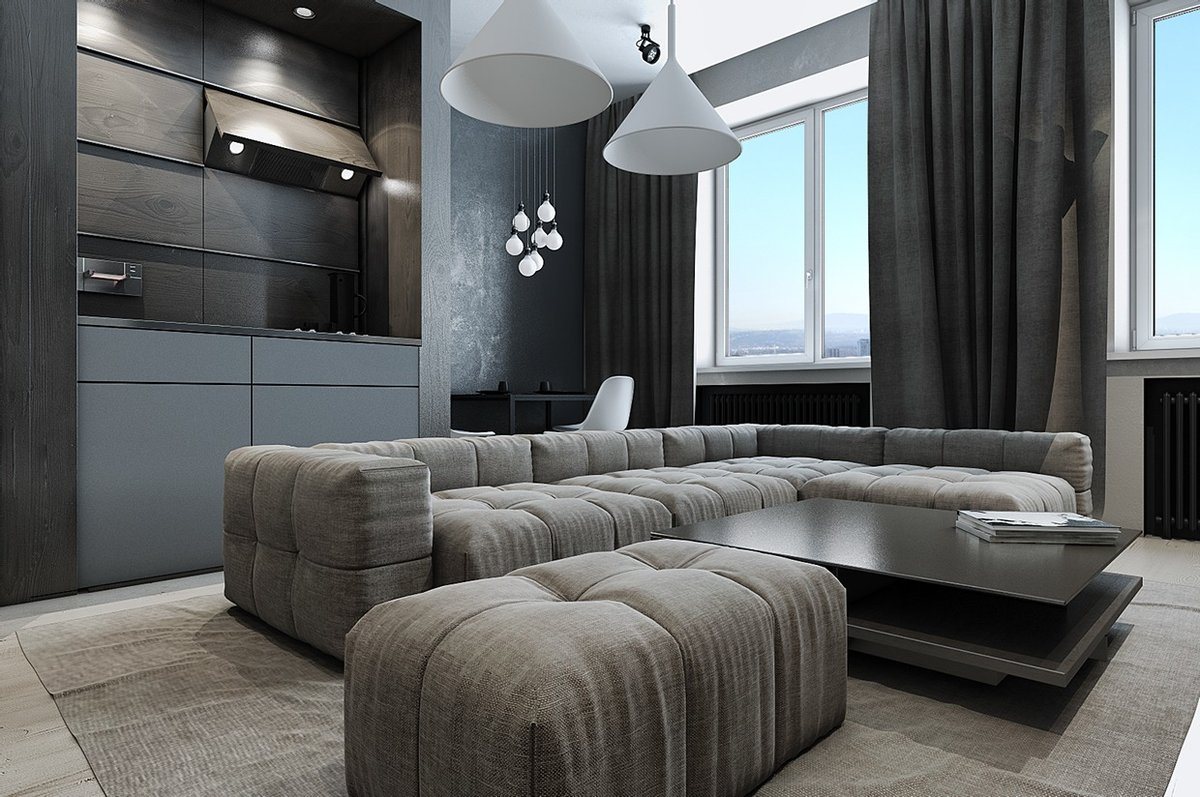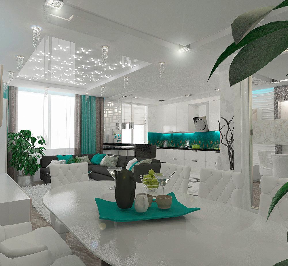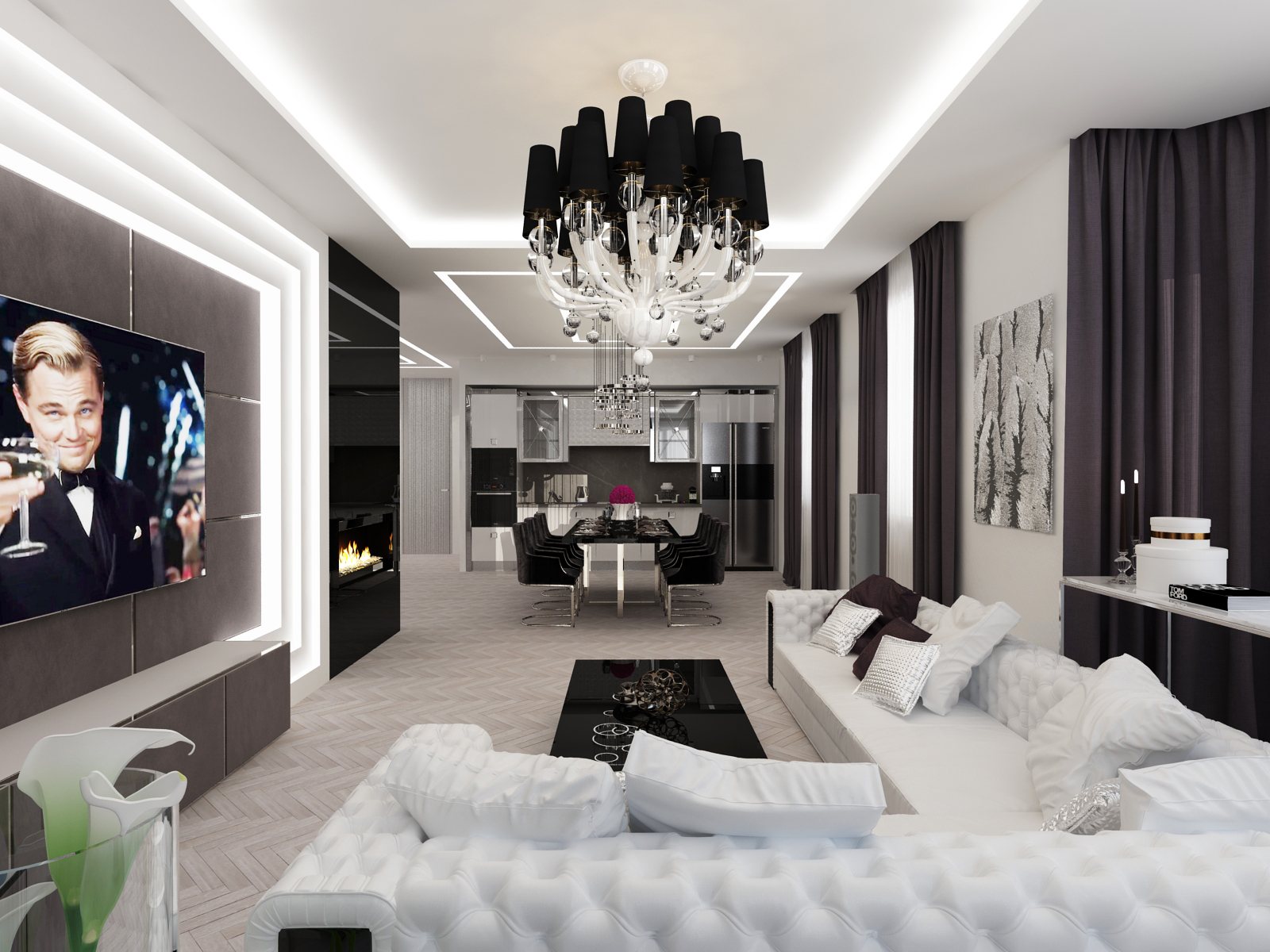 На пол при таком дизайне интерьера гостиной в этом случае кладут темно-серую с глянцевым блеском плитку, а потолок делают в контрастном белом цвете фактурной штукатуркой.