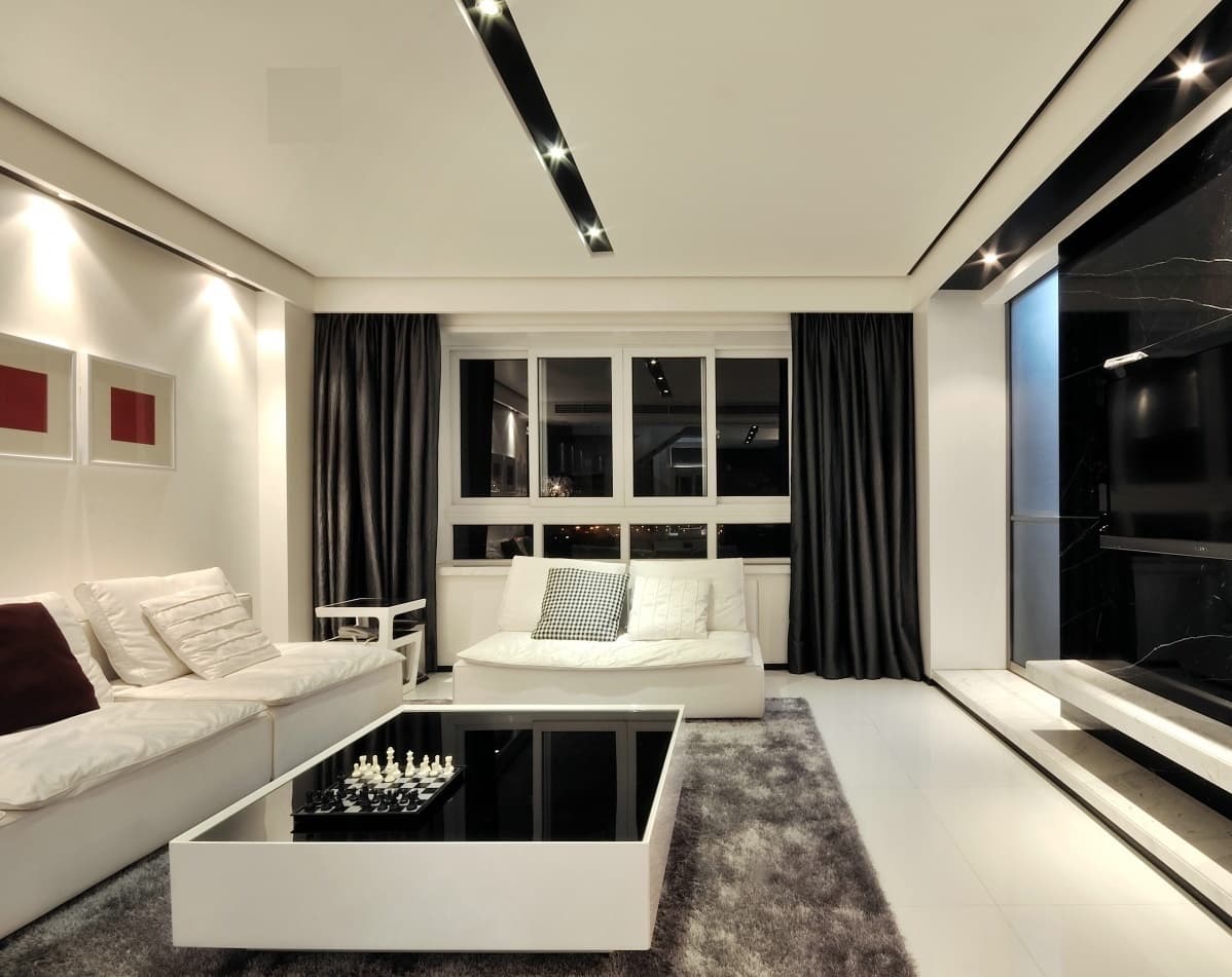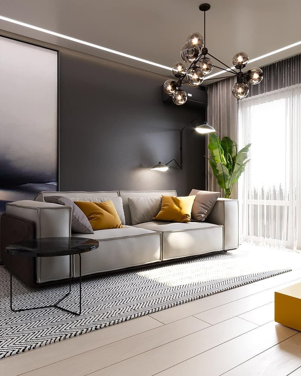 Белый, серый или черный в гостиной могут быть базовыми цветами, которые дополняются желтым или оранжевым; красным или зеленым.