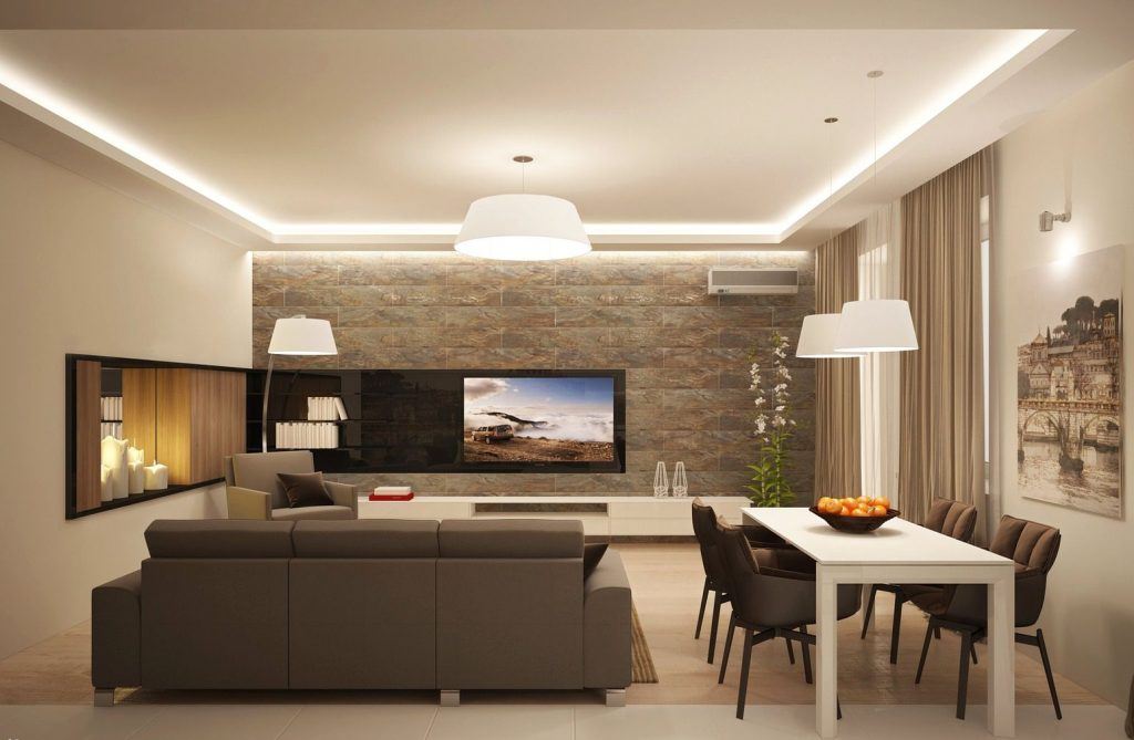 В его оформлении может использоваться абсолютно любая из известных технологий. Потолок может скрываться за натяжными и подвесными конструкциями. Его делают в современном дизайне гостиной ровным и многоярусным. В последнем случае перепады в его поверхности помогут зонировать площадь комнаты. Не ограничена отделка потолка и в цветовом решении.