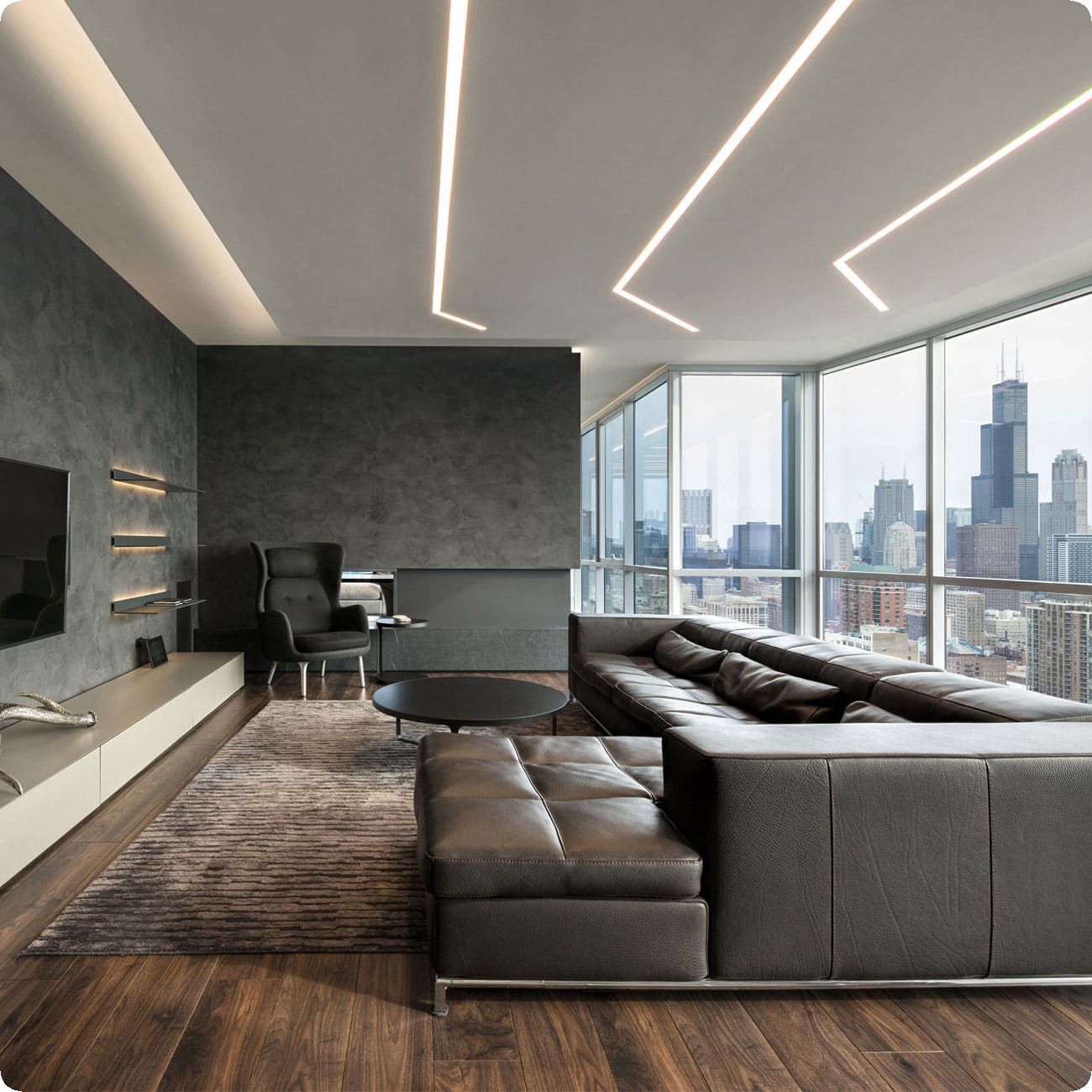 При организации освещения используются встроенные полосами потолочные светильники, торшеры и подсветку полки.