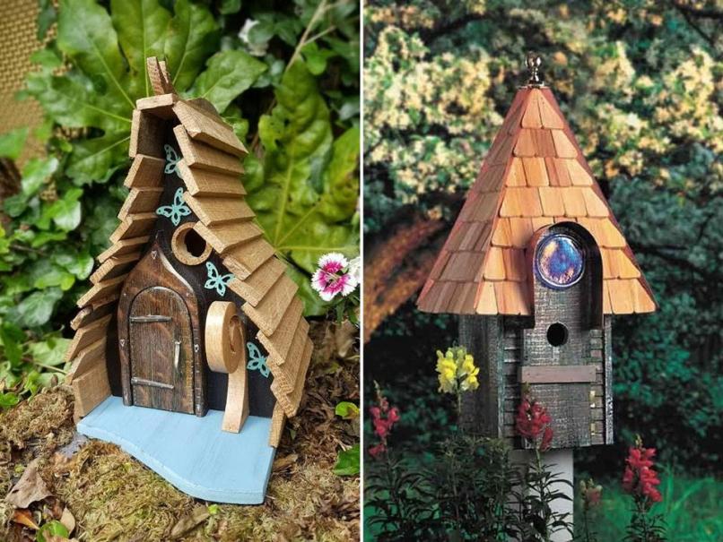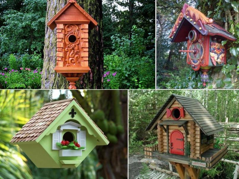 Два изящных домика для птичек на изображении вверху изготовлены с проявлением вкуса и старания. Повторить такое непросто. Создать подобное и свое — еще сложнее.