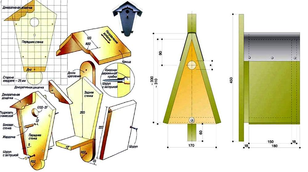 Первый и второй варианты – самые распространённые. Такие скворечники считаются простыми по исполнению, поскольку не нужно «заморачиваться» с вырезкой деталей.