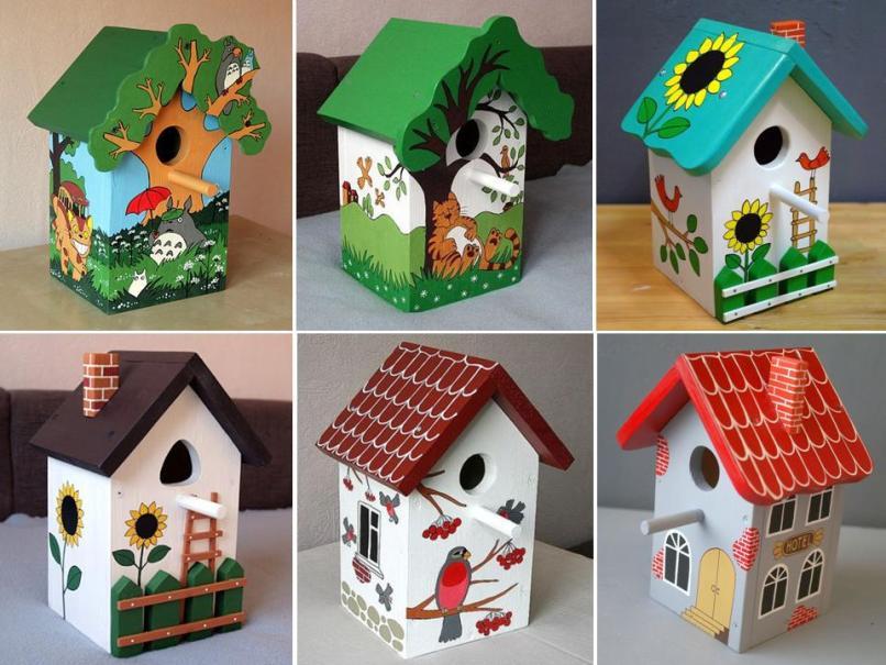 Если постараться, краски помогут превратить обычное птичье жилье в сказочный домик. Собственно конструкция не является сложной. Фантазия и старание – главные инструменты представленного успеха.