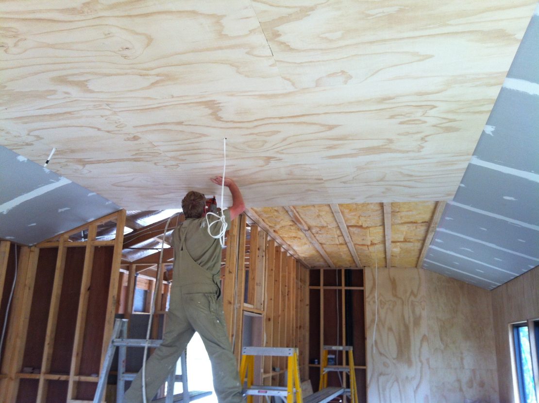 Если для интерьера помещения не важна текстура дерева, то потолки обшивают фанерой, ее притягивают саморезами и прибивают