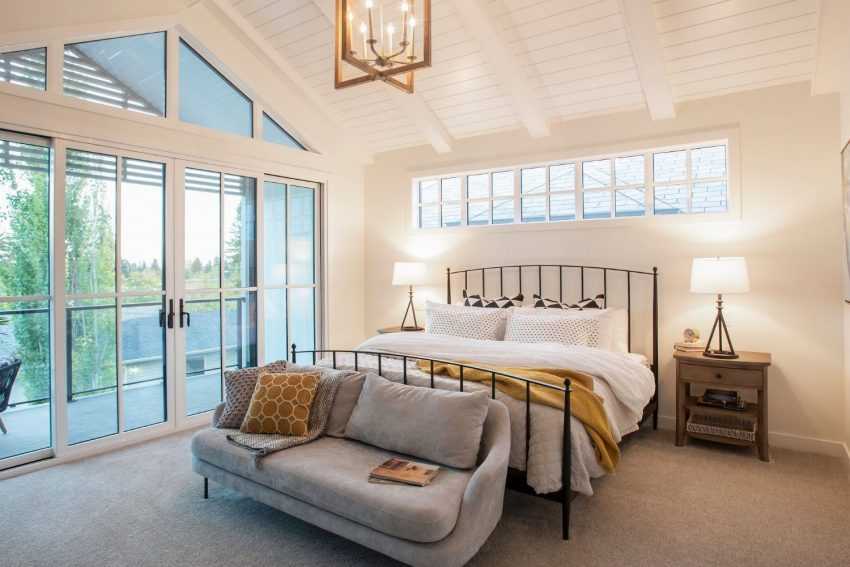 Большинство дизайнеров предпочитают использовать это преимущество. Спальное место устанавливается так, чтобы лежа на кровати было видно окно. Этот способ актуален для оконных проемов с выходом в лес, но не на открытую солнечную сторону.