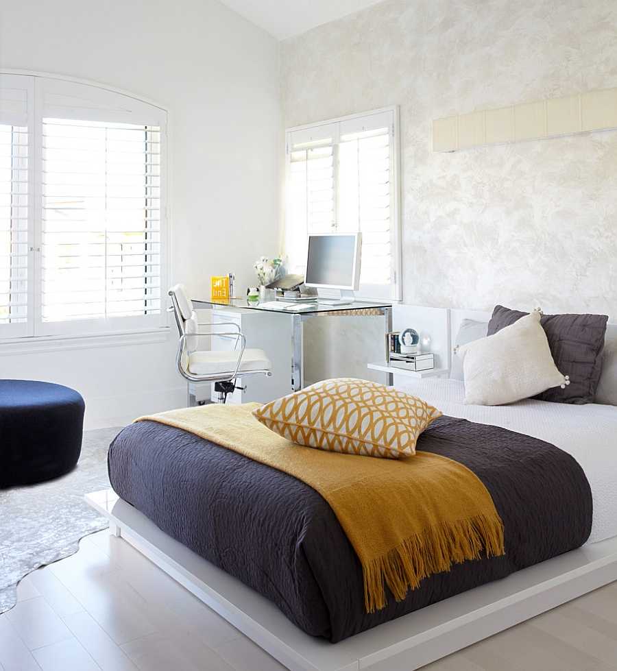 Можно располагать кровать напротив окна. Если окна выходят на восток, можно будет всегда просыпаться в хорошем настроении с лучами солнца. Но если такая перспектива не радует, можно повесить на окна жалюзи или плотные шторы.