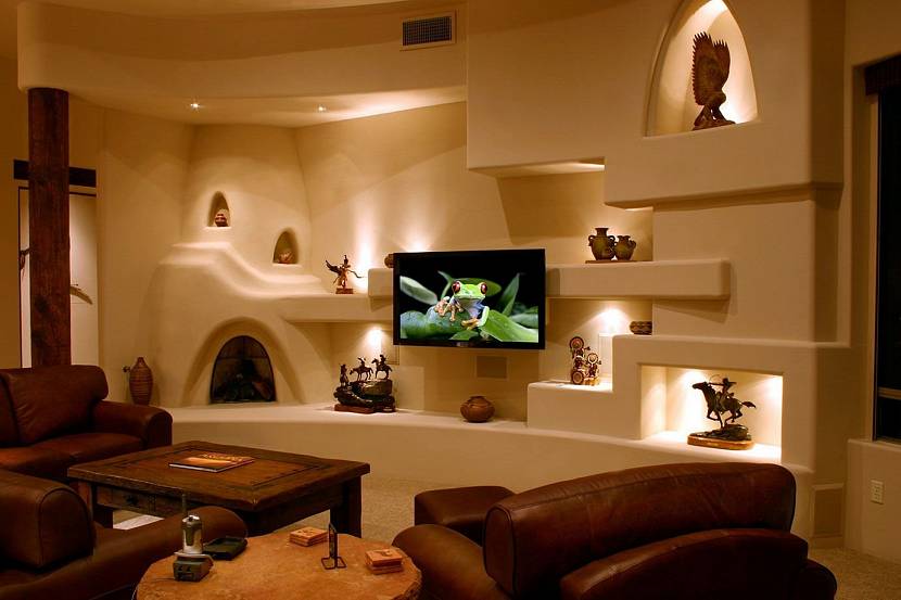 Если вы – счастливый обладатель большой, а, следовательно, и массивной плазменной панели, то повесить телевизор на гипсокартон так просто не получится. В этом случае предусматривать место в интерьере комнаты под телевизор лучше заранее. Оригинальная арка или ниша из гипсокартона будут отличным решением вопроса. Ну а если взялись за полки из гипсокартона под телевизор, то заодно можно сделать и ниши под акустику, двд-проигрыватель, полки под диски и прочую звуковую и видео аппаратуру.