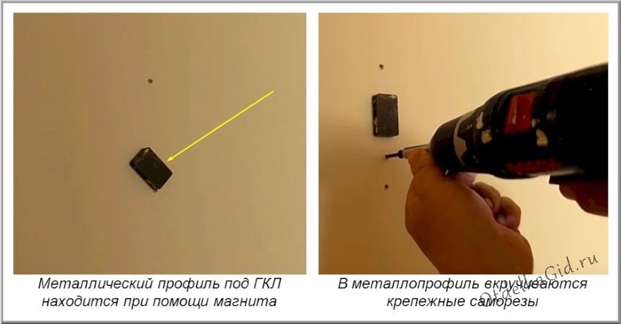 При фиксации через гипсокартон к несущей капитальной стене используется шпилька толщиной 8 – 12 мм, при этом глубина погружения шпильки в основу должна равняться расстоянию от ГКЛ до стены