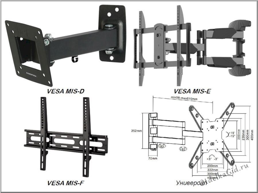 - VESA MIS-F. Предполагает установку оборудования с диагональю боле 31 дюйма. Для этой разновидности существует множество схем размещения отверстий, чаще всего встречаются 20 х 20, 50 х 30 и 90 х 60 см.