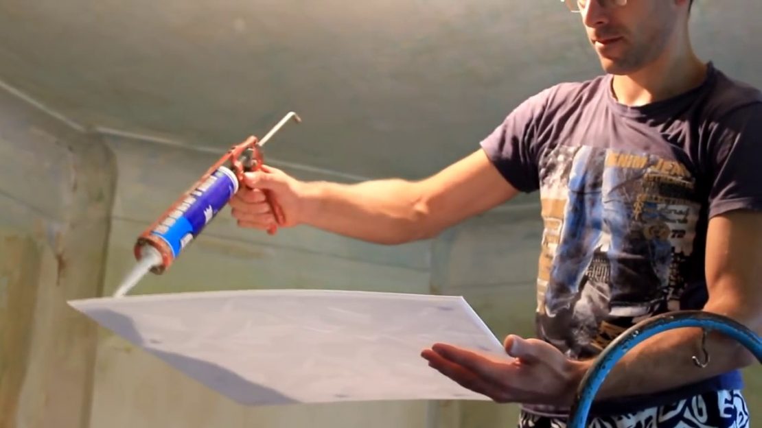 Выбор клея достаточно широк. Из опыта, наиболее удобны акриловые составы, типа «Сумасшедшая липучка». Но вполне подойдут и более дешёвые клея (типа «Драгон», «Титан»). Удобен быстросхватывающийся «Момент» продаваемый в тубах, правда, для его нанесения (выдавливания из тубы) понадобится рычажный «пистолет». Тут об оклейке потолка плиткой подробнее .