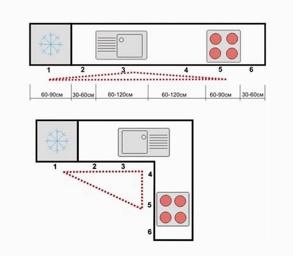Расположение ключевых элементов на кухне, холодильника, плиты и раковины, определяется расположением кухонной мебели. Для удобства и быстроты приготовления расстояние между этими тремя элементами не должно быть большим. При этом между рабочей зоной и обеденным столом должно оставаться свободное место для легкого передвижения: как минимум, это 90 см, а лучше 120 см.
