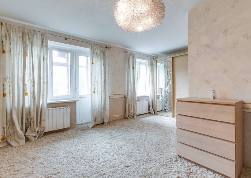 Если потолок не очень высокий, то визуально поднять его поможет натяжной глянцевый потолок светлого тона с точечным освещением по периметру. Наиболее подходящим и популярным в последнее время, является паркетная доска в качестве напольного покрытия.