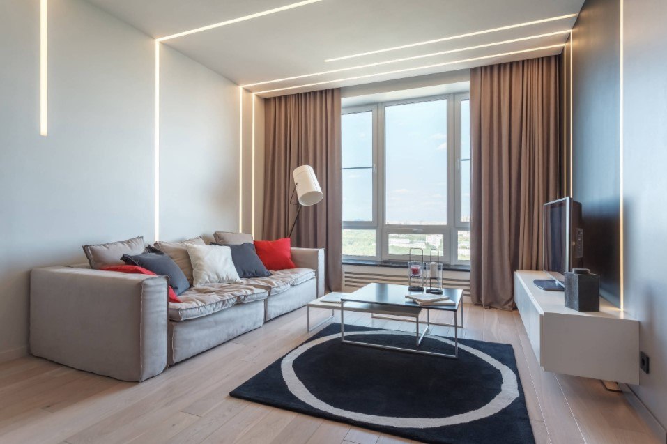 Дизайнерское решение для прямоугольной гостиной комнаты