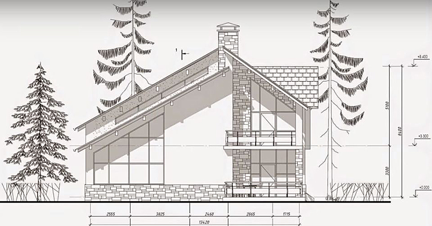 Совершенно отдельно вычерчивается фасад дачного дома, показывается внешний вид строения. На основе такого чертежа подбирается угол наклона кровли, рассчитывается нужное количество окон. На последнем этапе выбирается материал, и производится расчет его необходимого количества.
