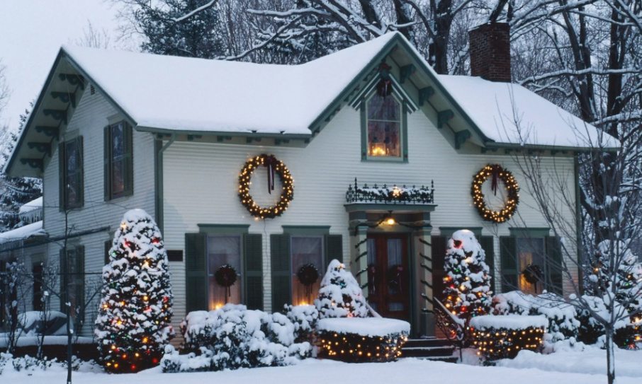 Быстро превратить обычный фасад дома в праздничный можно с помощью гирлянд. Их можно развешивать по периметру фасада, украшать ими окна, двери, колонны, ограждения веранды.