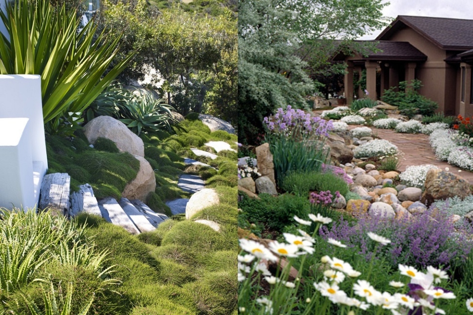 Камни, красиво разложенные во дворе, можно украсить травой или цветами. Островки цветов различных видов прекрасно сочетаются с цветом камней.