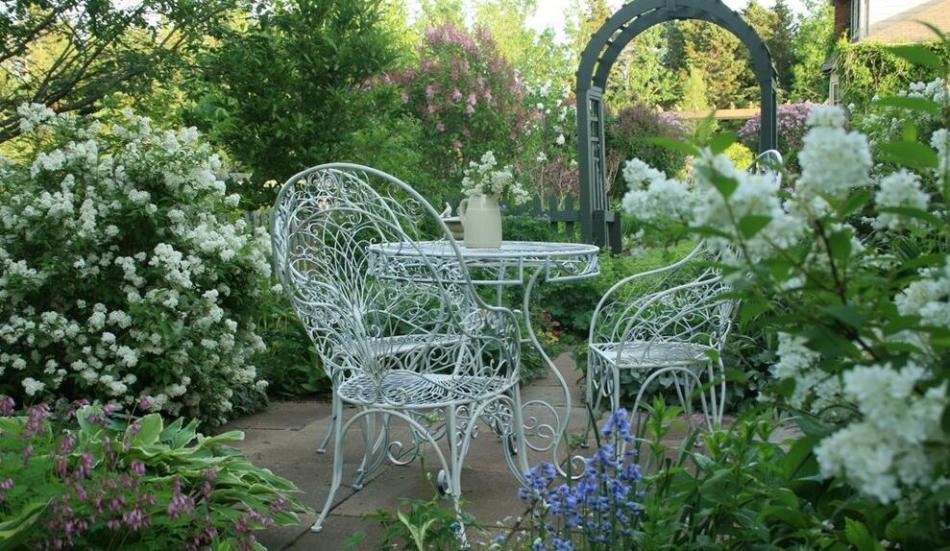 А так выглядят уютные уголки ухоженного сада. Садовая мебель из кованого железа может быть ажурной и гармонировать с растениями.