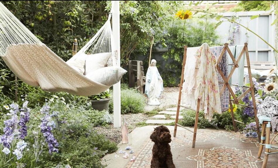Гамак, подвешенный на деревья или столбы, способствует летнему отдыху и добавляет изюминку в дизайн двора частного дома.