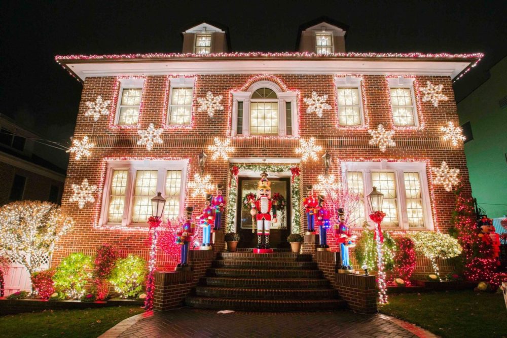 Традиционный красный цвет и яркие огоньки на фасаде создают новогоднее настроение даже в странах с тёплым климатом