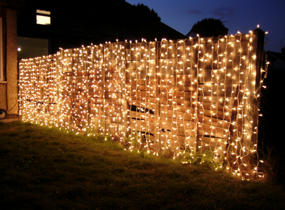 Независимо от материала ограждение заиграет новыми красками, если на него просто накинуть гирлянду-сеть.