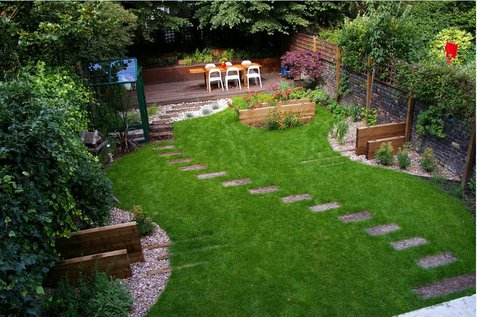 Главными элементами сада являются цветники, которые располагаются по обе стороны от дорожки, ведущей от калитки к крыльцу. Дизайн цветников самый разнообразный, но при их разбивке следует учесть, что пестрость клумб и нагромождение множества видов растительности утомляет взгляд. Ландшафтные дизайнеры рекомендуют перемежать клумбы со стрижеными газонами и разделять их невысокими живыми изгородями.
