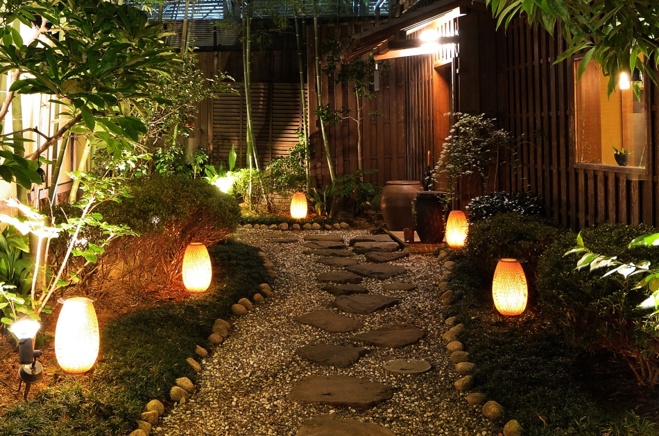 Подсветка фонариками частного двора в вечернее и ночное время, сделают его сказочно красивым. Для экономного освещения установите фонарики на солнечных батареях.