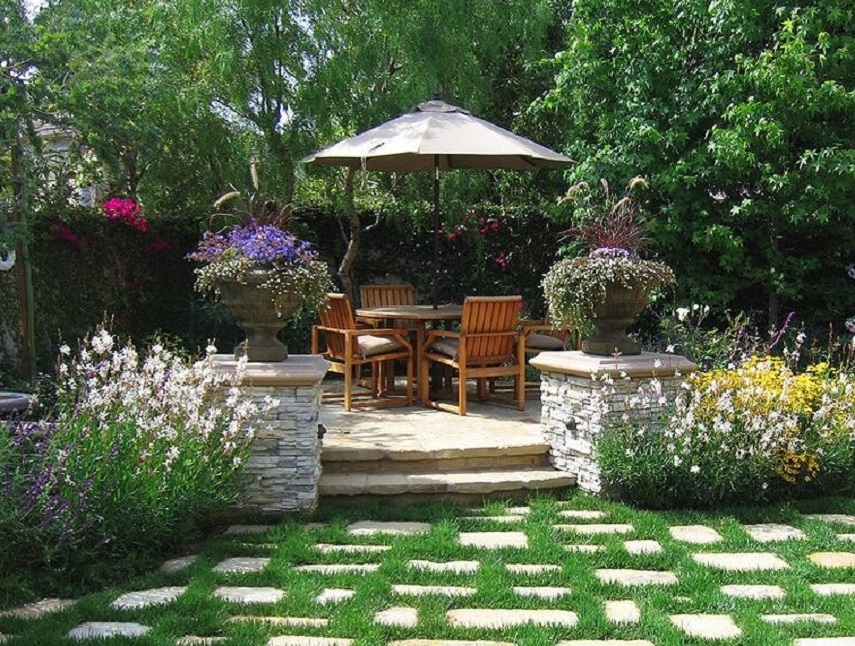 Аллейки, вымощенные камнями, располагают вдоль зоны отдыха. Здесь можно поставить скамейки и маленькие столики. Цветы и красивые травы дополняют такой дизайн двора частного дома.