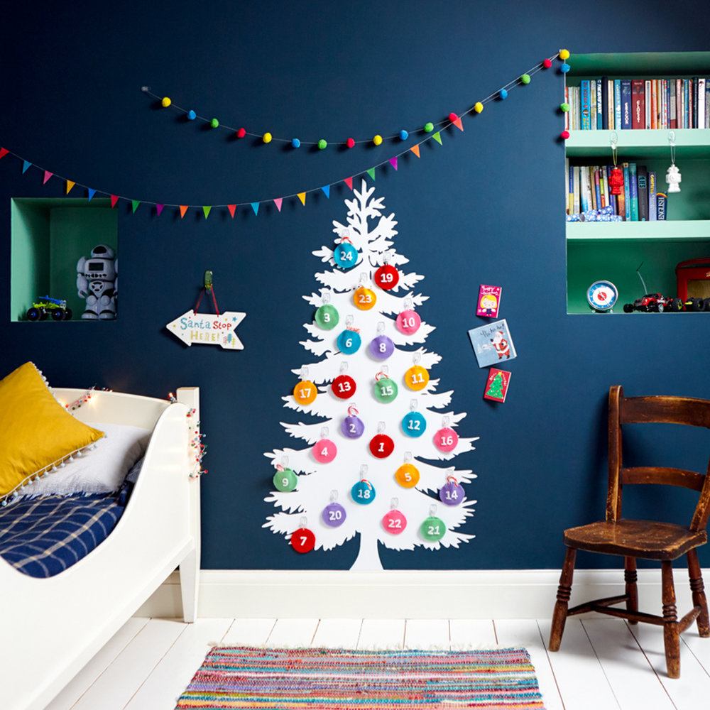 Красиво смотрятся на стенах тематические панно, рождественские сапоги, праздничные календари, гирлянды из конфет и шоколада, шары и фонарики, адвент-календари и декоративные елки. Из частей фанеры можно вырезать фигурки звездочек, елок и снежинок, раскрасив их акрилом или гуашью.