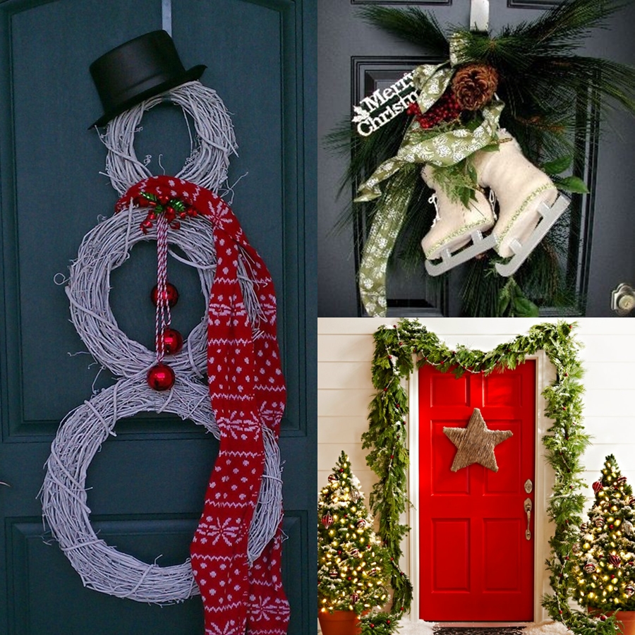 На входную дверь можно повесить снежинки, праздничные открытки, гирлянды или коньки, повешенные на гвоздик. Есть другие способы создания венков для новогоднего декора своими руками: