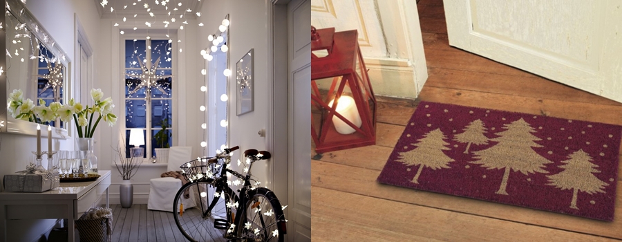 Любая квартира начинается в прихожей, поэтому про оформление входной зоны забывать не стоит. Положите у двери небольшой коврик с новогодним рисунком или забавными надписями.