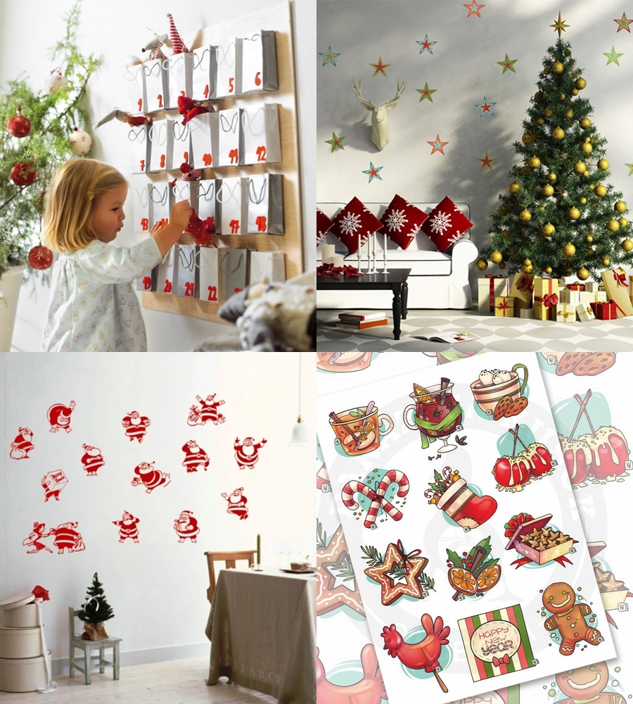 Как же украсить стены своего дома к Новому году? Можно купить в магазине яркие принты и стикеры на новогоднюю тематику, аппликации снежинок, фигурок снеговиков или животных. При этом наклейки должны легко сниматься, чтобы не испортить внешний вид обоев, кафельной плитки или декоративной штукатурки.