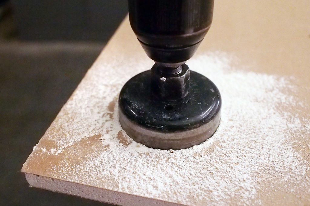 Далее из гипсокартонного листа вырезают квадрат с размерами на 40-50 мм больше дыры. С помощью все той же коронки с тыльной стороны квадрата аккуратно, чтобы не повредить лицевой картонный слой, высверливают заплатку.