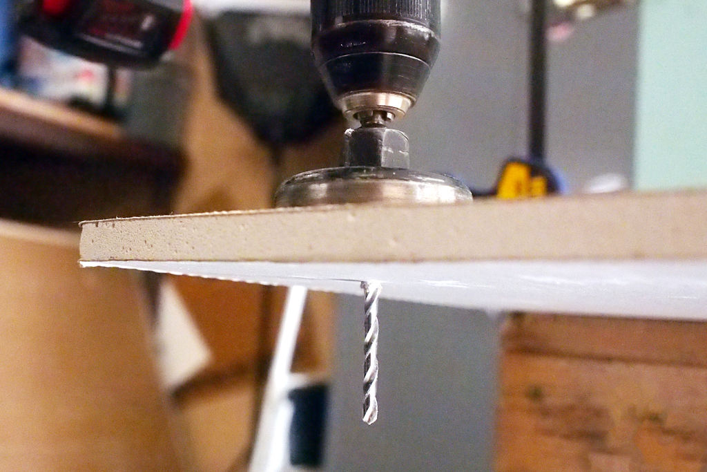 Коронка должна пройти сквозь внутренний гипсовый слой, но не прорезать нижний слой бумаги. Если вы все-таки случайно прорезали насквозь, начните резать заново в другом месте. Нижний слой бумаги вам понадобится для заплатки поверх вставыша.